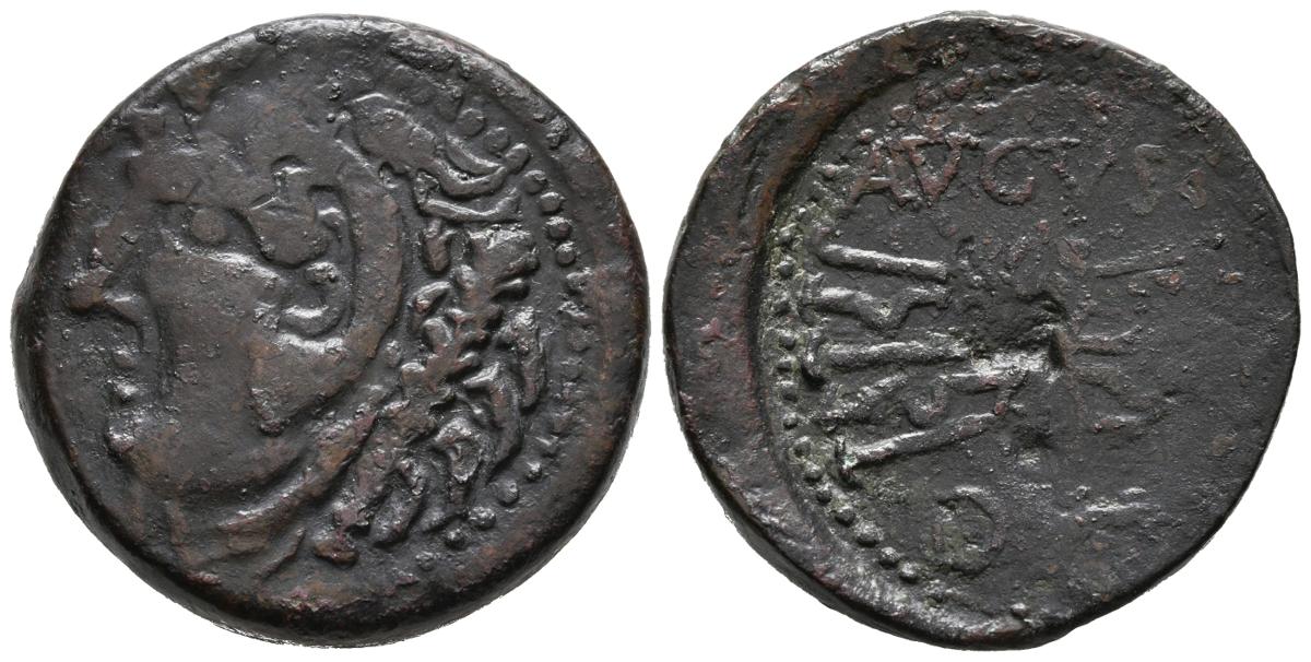 GADES (Cádiz). Dupondio. (Ae. 23.14g / 29mm). 27 BC-14 AD (FAB-1378). Anv: Head of Hercules with lion skin on the left, behind nails. Rev: Beam of rays between legend: AVGVSTVS DIVI F. Very Fine/ Almost Very Fine. Countermark on reverse.