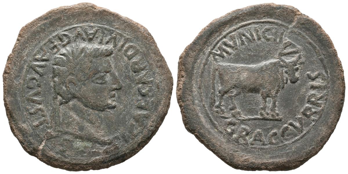 GRACURRIS (Alfaro, La Rioja). As. (Ae. 15.56g / 33mm). 14-36 AD (FAB-1391). Anv: Laureate head of Tiberius on the right, around legend: TI CAESAR DIVI AVG F AVGVSTVS. Rev: Bull to the right, around legend: MVNICIP GRACVRRIS. Good Very Fine.