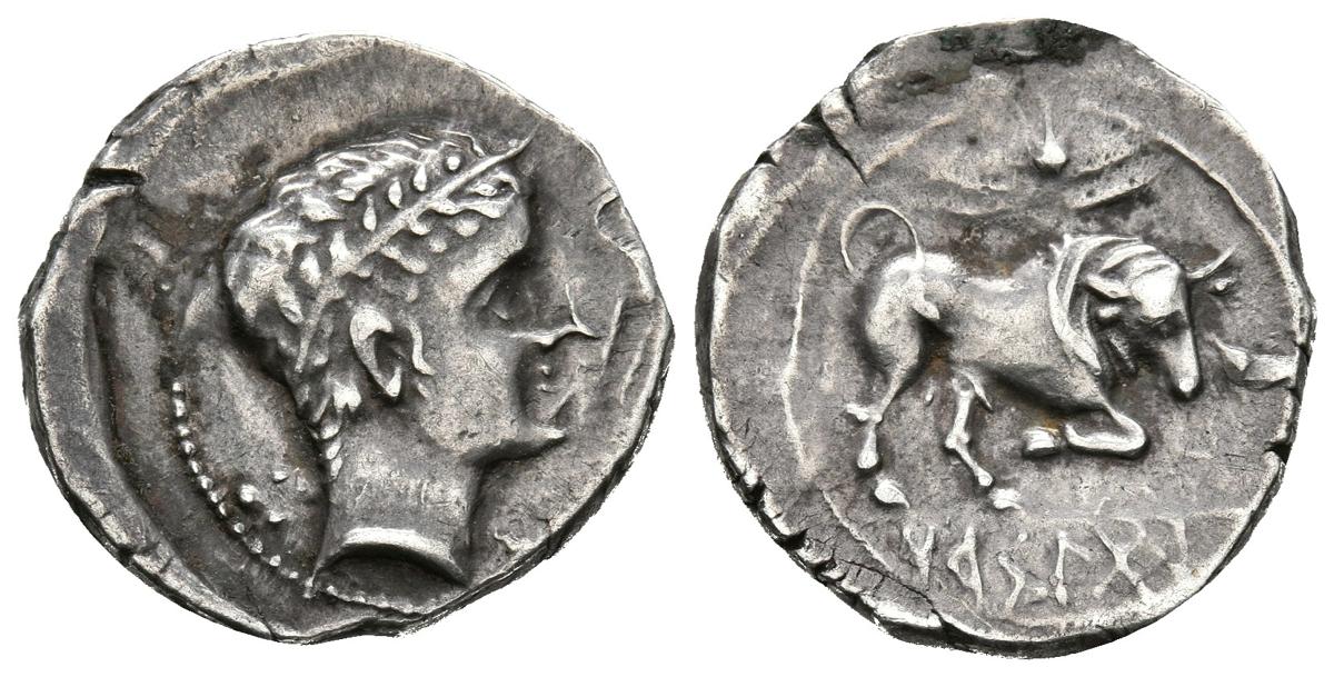 ARSE-SAGUNTO. (Sagunto, Valencia). Drachm. (Ar. 2.99g / 18mm). 300-200 BC (FAB-2034). Anv: Head of Hercules laureate to the right, behind nails, in front of dolphin. Rev: Bull charging to the right, above the shell, below the Iberian legend line: ARSGiTAR. Good Very Fine. Rare and beautiful specimen.