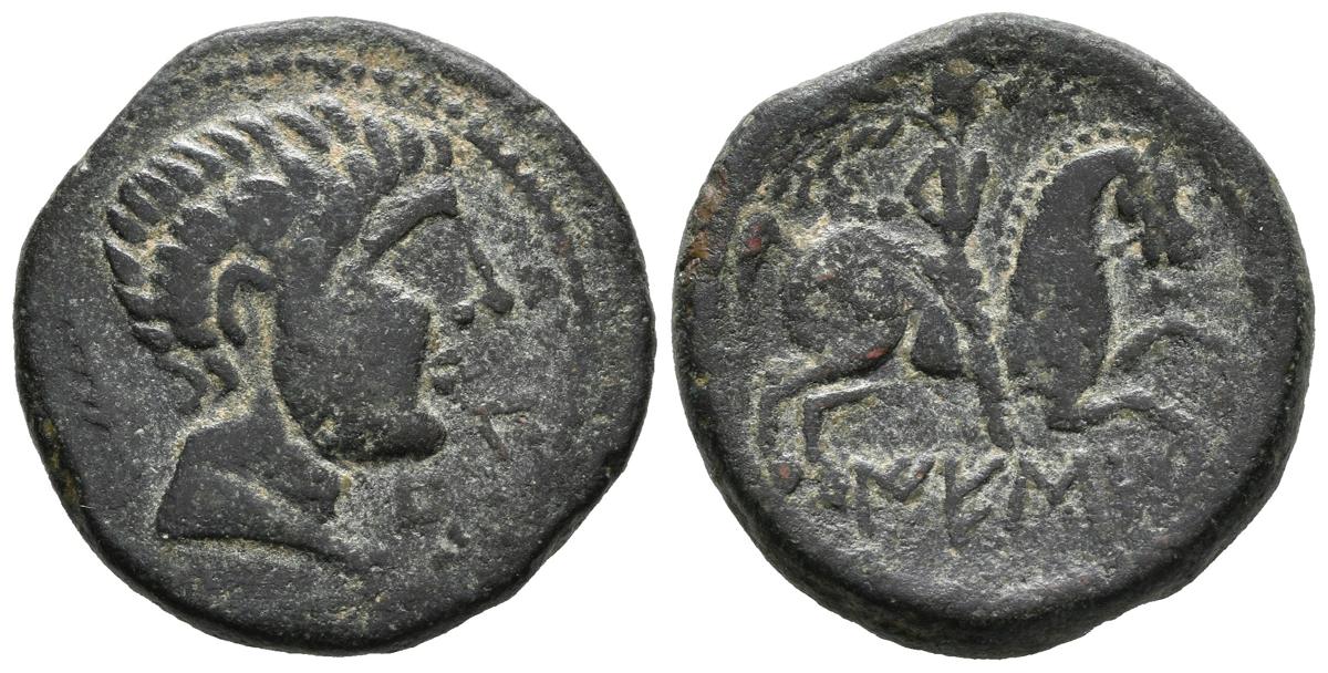 IESO (Guisona, Lérida). As. (Ae. 9.10g / 24mm). 120-20 BC (FAB-1424). Anv: Male head to the right, behind palm, in front of Iberian letters BeL. Rev: Rider with palm to the right, below Iberian legend: IESO. Almost Very Fine.