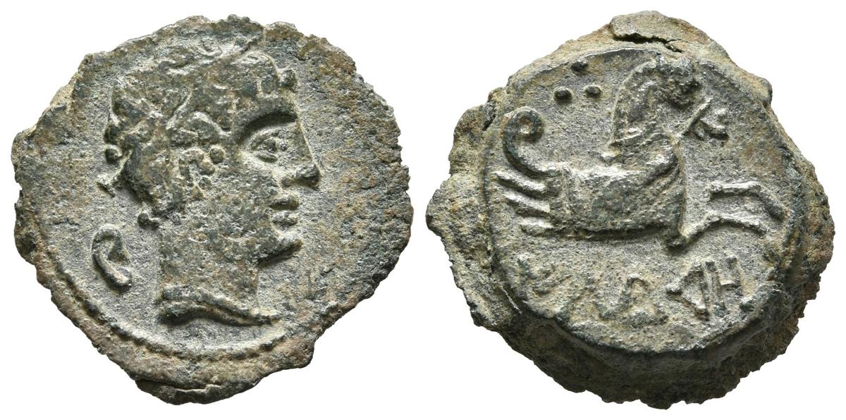 ILDURO (Mataró, Barcelona). Quadrant. (Ae. 3.95g / 18mm). 120-20 BC (FAB does not quote; Villaronga 16). Anv: Male head to the right, behind the ear. Rev: Hiccup field to the right, above three points, below Iberian legend: ILDuRO. Good Very Fine. Nice specimen, scarce like that.