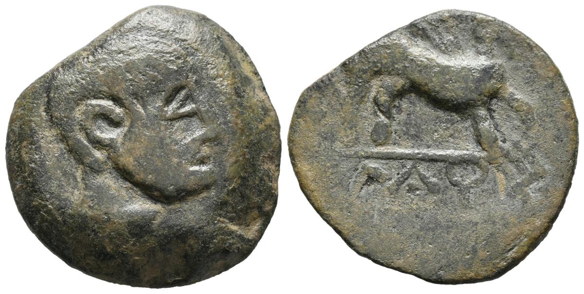 ILIBERRI (Granada). As. (Ae. 13.85g / 26mm). 150-20 BC (FAB-1501). Anv: Male head to the right. Rev: Sphinx on the right, below the Iberian legend line: ILDu. Very Fine.