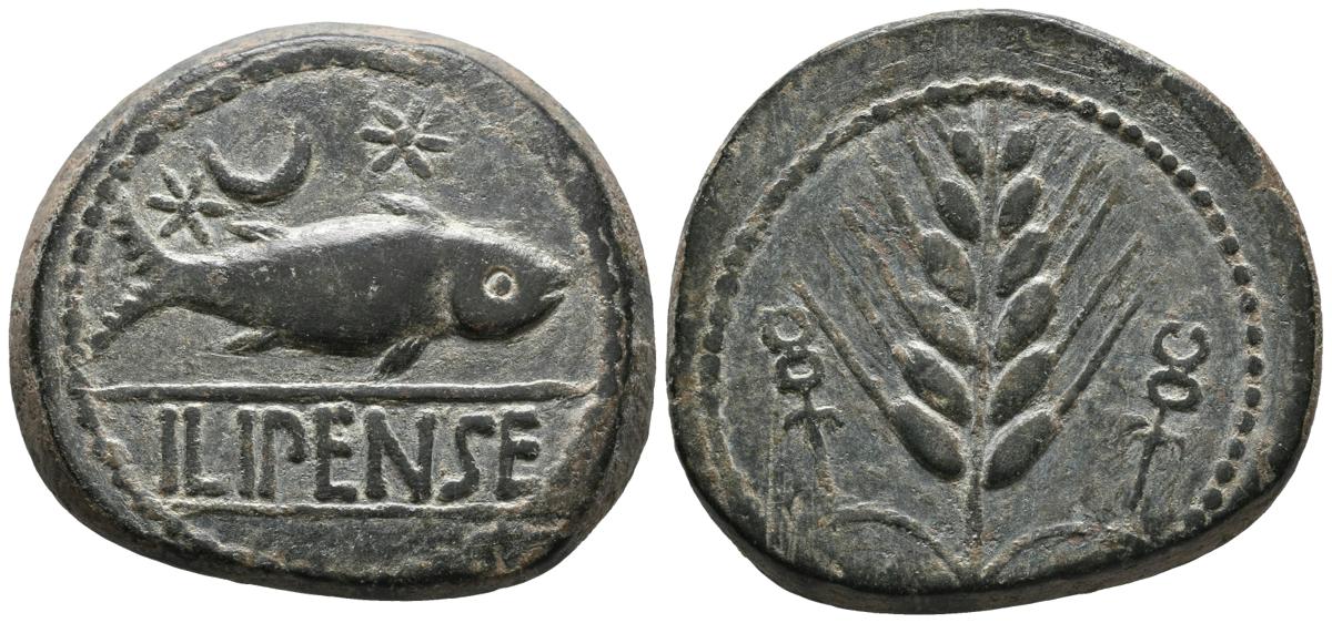 English ILIPENSE (Alcalá del Río, Sevilla). Dupondio. (Ae. 30.25g / 36mm). 120-20 BC (FAB-1530). Anv: Chad on the right, above crescent between two stars, below legend between two lines: ILIPENSE. Good Very Fine. Very rare.