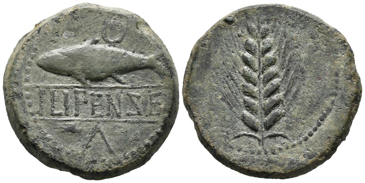 ILIPENSE (Alcalá del Río, Sevilla). As. (Ae. 20.91g / 31mm). 120-20 BC (FAB-1533). Anv: Tarpon on the left, above crescent, below legend between two lines: ILIPENSE, below A. Rev: Spike. Very Fine.