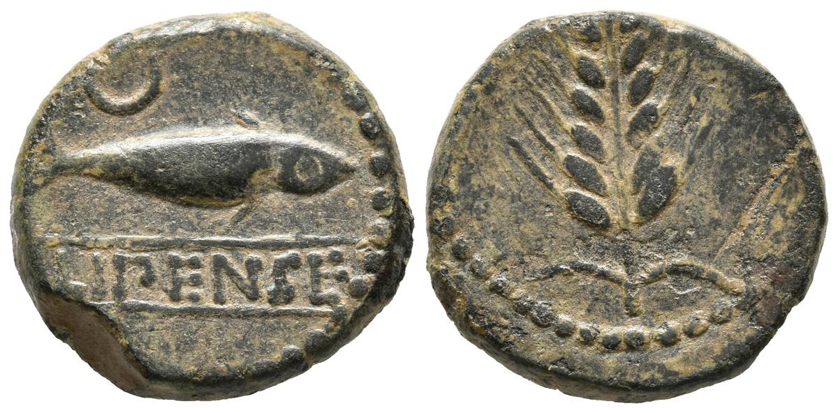 English ILIPENSE (Alcalá del Río, Sevilla). Quadrant. (Ae. 6.12g / 19mm). 120-20 BC (FAB-1538). Anv: Chad on the right, above crescent, below legend between two lines: ILIPENSE. Rev: Spike. Almost Very Fine.