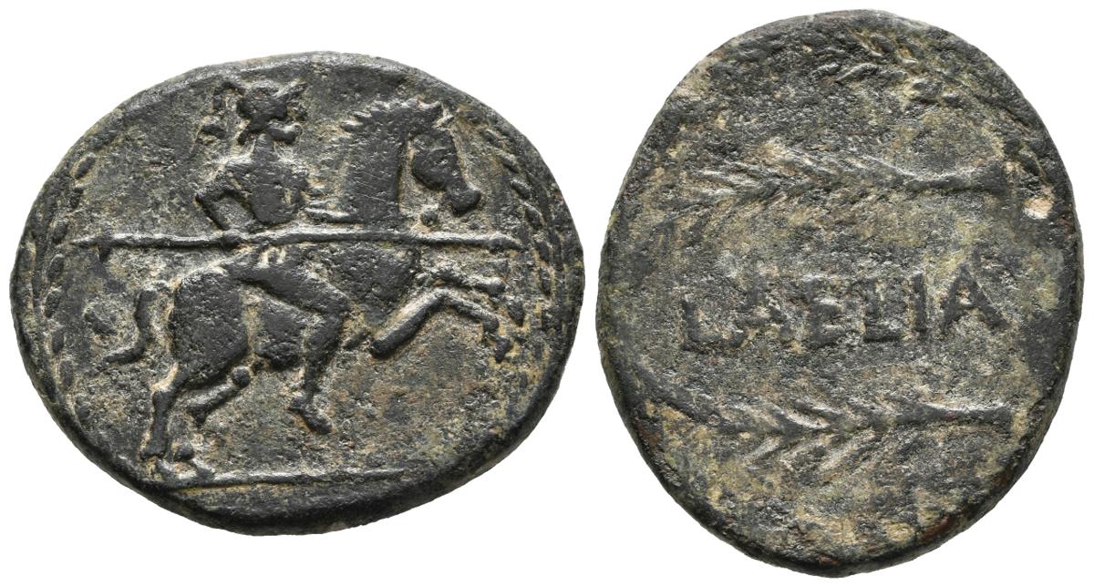 LAELIA (Olivares, Sevilla). As. (Ae. 10.12g / 29mm). 50-20 BC (FAB-1649). Anv: Rider with spear to the right. Rev: Spikes on the left, including legend: LAELIA. Very Fine.