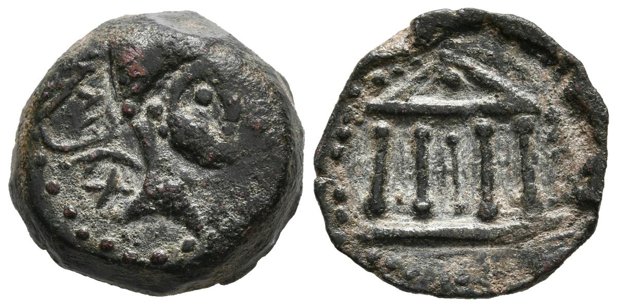 MALACA (Malaga). Semis. (Ae. 5.71g / 18mm). 200-20 BC (FAB-1738). Anv: Vulcan head to the right, behind type B Punic legend. Rev: Tetrastyle temple. Good Very Fine.