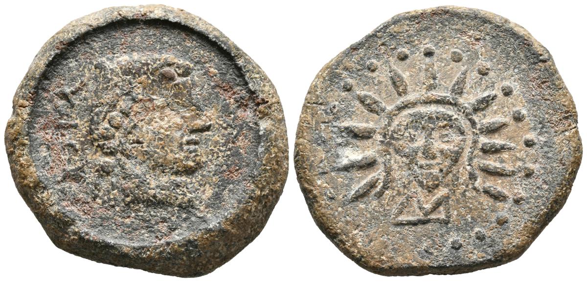 MALACA (Malaga). Monetiform lead. (Pb. 34.01g / 32mm). (CCP does not quote). Anv: Head of Vulcan to the right, behind Punic legend, in front of pincers. Rev: Bust of Helios draped and surrounded by twelve rays. Very Fine. Nice patina. Very rare. Former Martí Hervera & Soler y Llach, Auction 64 (02/22/2011), lot 205.