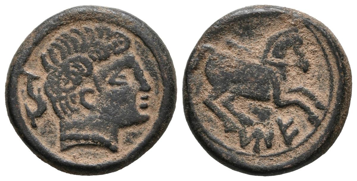MEDUAINUM (North of the Ebro). Semis. (Ae. 4.01g / 17mm). 120-20 BC (FAB-1751). Anv: Male head to right, behind dolphin. Rev: Horse to the right, below Iberian letters: ME. Good Very Fine. Very rare.
