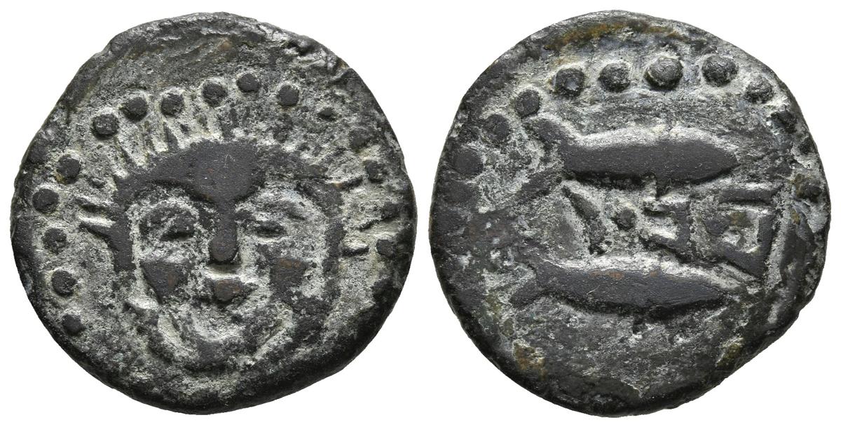 ASIDO (Medina Sidonia, Cádiz). Semis. (Ae. 3.56g / 19mm). 50 BC (FAB-155). Anv: Head of Hercules from the front. Rev: Two tunas on the right, including a Libyan-Phoenician legend. Very Fine.