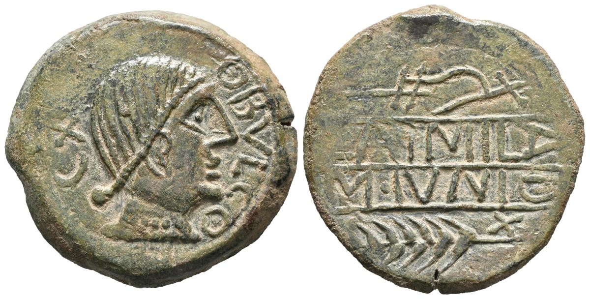 OBULCO (Porcuna, Jaén). As. (Ae. 15.53g / 31m). 220-20 BC (FAB-1819). Anv: Female head to the right, growing behind and letter Ta, in front legend: OBVLCO. Rev: Plowed to the right, under the spike to the left on the letter Ta, including legend: L AIMIL / M IVNI / AID. Good Very Fine.