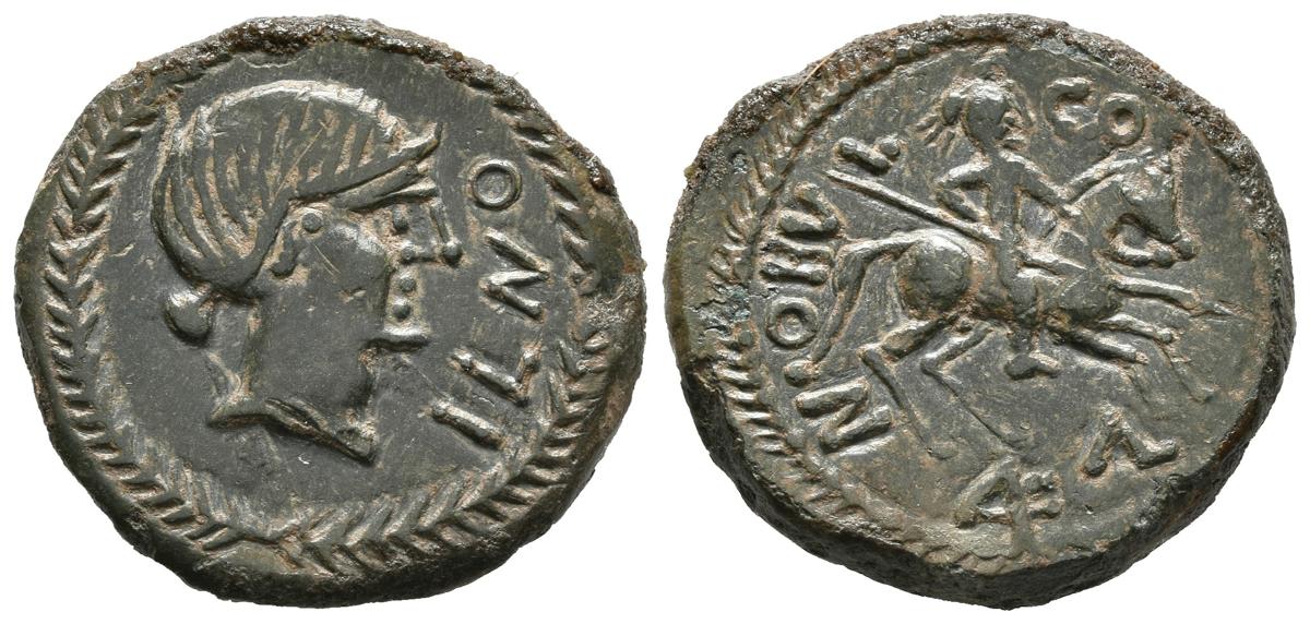 OBULCO (Porcuna, Jaén). Semis. (Ae. 5.05g / 22mm). 220-20 BC (FAB-1829). Anv: Female head to the right, front legend: ILNO, all within laurea. Rev: Rider on the right, around legend: OBVLCO NAAL. Good Very Fine. Nice specimen.