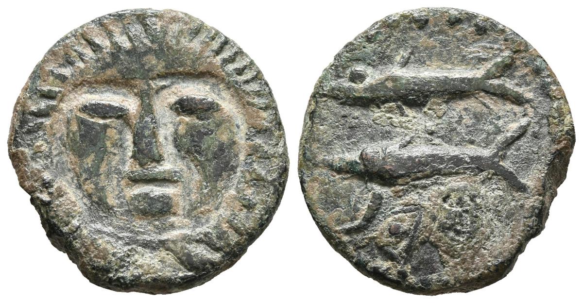 ASIDO (Medina Sidonia, Cádiz). Semis. (Ae. 3.56g / 19mm). 50 BC (FAB-156). Anv: Head of Hercules from the front. Rev: Two tunas on the left, below Libyan-Phoenician legend. Good Very Fine.