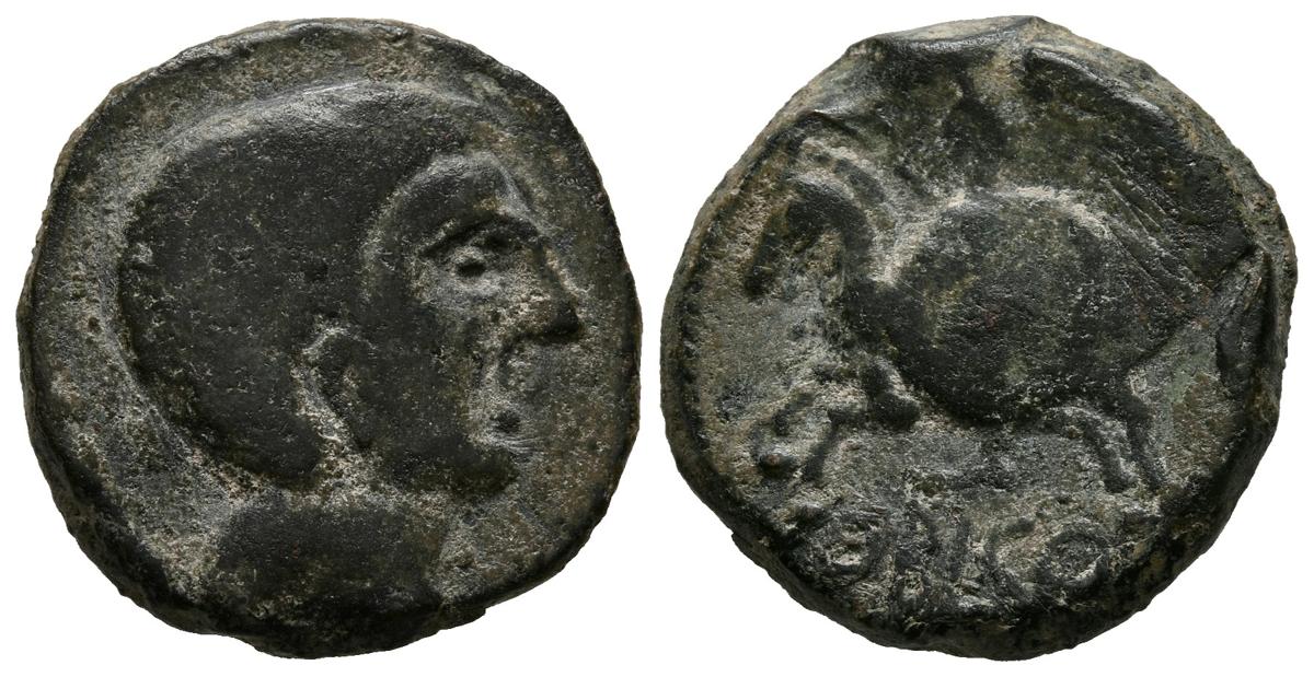 OBULCO (Porcuna, Jaén). Semis. (Ae. 6.31g / 19mm). 220-20 BC (FAB-1851). Anv: Male head to the right. Rev: Horseman with spear and shield on the left, below legend: OBVLCO. Almost Very Fine.