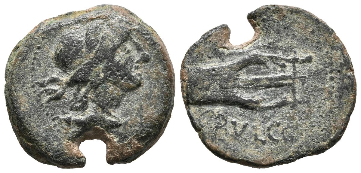 OBULCO (Porcuna, Jaén). Semis. (Ae. 4.99g / 19mm). 220-20 BC (FAB-1852). Anv: Female head to the right. Rev: Lyre between crescent on IIII and legend: OBVLCO. Almost Very Fine.
