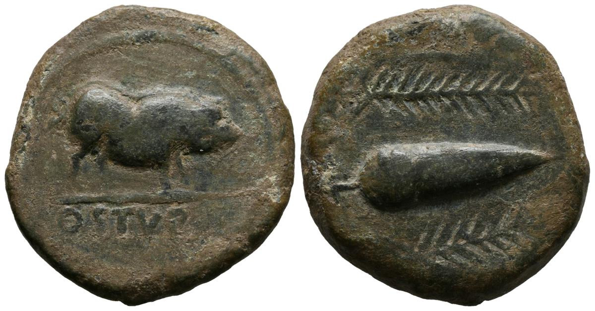 OSTUR (Carmona area, Sevilla). As. (Ae. 19.76g / 31mm). 150-50 BC (FAB-1973). Anv: Wild boar to the right on the line, below legend: OSTVR. Rev: Acorn between two ears on the right. Very Fine. Scarce as well.