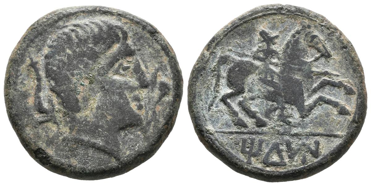 TIDUM (Area of Aragon). As. (Ae. 8.61g / 23mm). 120-20 BC (FAB-2388). Anv: Male head to right, in front of dolphin, behind plow. Rev: Rider with spear to the right, below Iberian legend under line: TiDuM. Almost Very Fine.