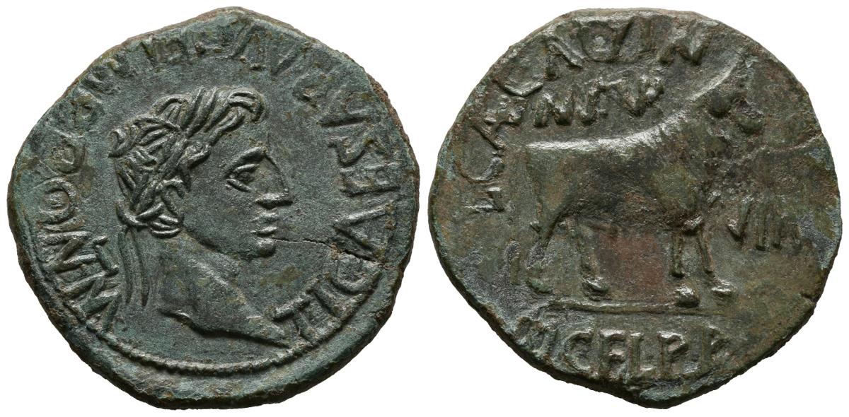English TURIASO (Tarazona, Zaragoza). As. (Ae. 12.67g / 30mm). 14-36 AD (FAB-2454). Anv: Head of Tiberius awarded to the right, around legend: TI CAESAR AVG F IMP PONT M. Rev: Bull on line, above MVN TVR, front: II VIR, around legend: M CEL PALDV. Good Very Fine.