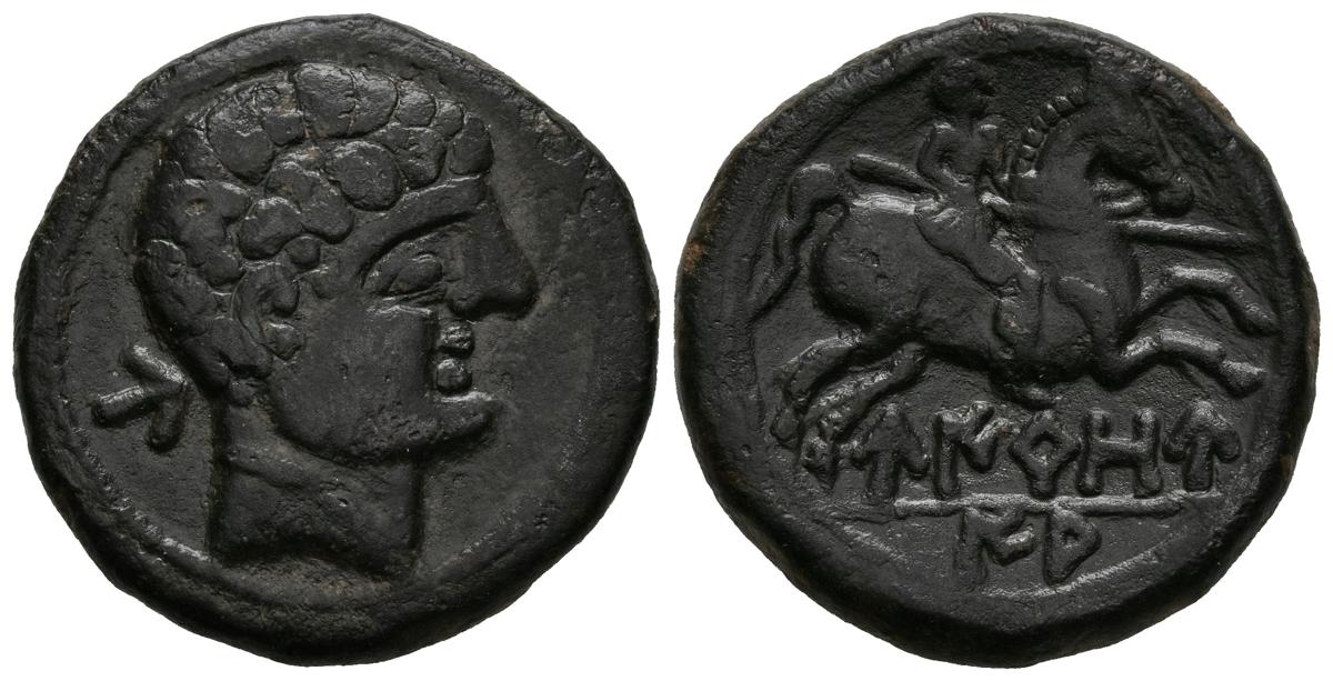 English UIOURIAS (Borobia, Soria). As. (Ae. 10.50g / 25mm). 120-20 BC (FAB-2483). Anv: Male head to the right, behind Iberian letter: U. Rev: Horseman with spear to the right, below with Iberian legend in two parts with lines between them: UIROU / IAS. Good Very Fine.