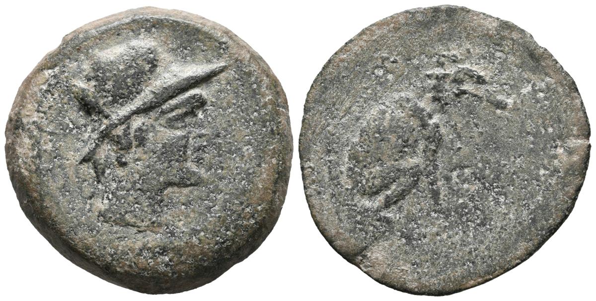 URSONE (Osuna, Sevilla). As. (Ae. 15.04g / 30mm). 50 BC (FAB-2496). Anv: Female head with helmet on the right, behind legend: VRSONE. Rev: Bear sitting right, back monogram MA. Almost Very Fine.