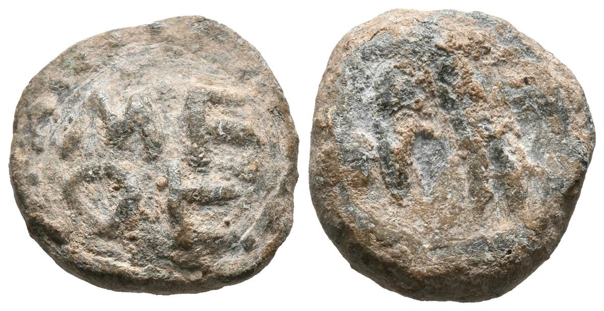 UNCERTAIN. Monetiform lead. (Pb. 6.20g / 16mm). (CCP-13b). Anv: Legend: MFQF on two lines, within dotted graph. Rev: Dog to the right, palm above. Very Fine.