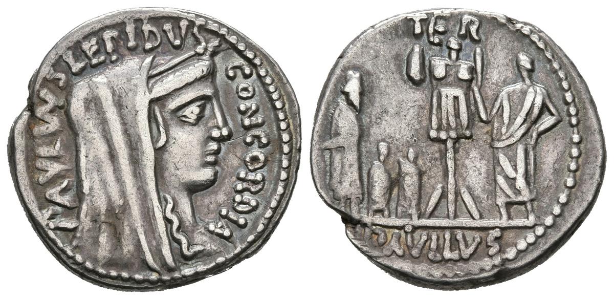 GENS AEMILIA. Denarius. (Ar. 3.88g / 19mm). 62 BC Rome. (FFC 126; Crawford 415/1). Anv: Head of Concordia diademed and veiled to the right, around legend: PAVLLVS LEPIDVS CONCORDIA. Rev: L. Aemilius Lepidus standing to the left leaning on a trophy, in front, Perseus of Macedonia standing to the right with his hands tied together with his children, above: TER, in exergue: PAVLLVS. Very Fine.