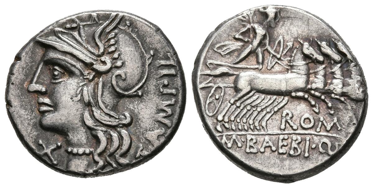 GENS BAEBIA. Denarius. (Ar. 3.92g / 18mm). 137 BC Rome. (FFC 198; Crawford 236 / 1a). Anv: Head of Rome to the left, in front X, behind legend: TAMPIL. Rev: Apollo in chariot to the right, below legend: ROMA, in exergue: M BAEBI Q F. Very Fine.