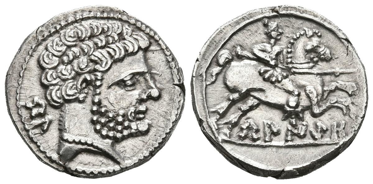 BELIGIOM (Belchite, Zaragoza). Denarius. (Ar. 4.01g / 18mm). 120-20 BC (FAB-242). Anv: Bearded head to the right, behind Iberian letter: BeL. Rev: Rider with spear to the right, below Iberian legend: BeLIGIO. Extremely Fine. Beautiful specimen, very rare in this spectacular quality.
