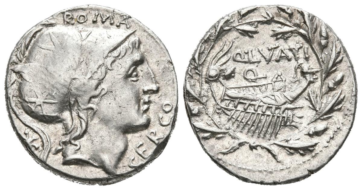 GENS LUTATIA. Denarius. (Ar. 3.91g / 20mm). 109-108 BC Southeastern Italy. (FFC 828; Crawford 305/1). Anv: Apollo's head to the right, behind star, in front: FENCE, above: ROME. Rev: Galley on the right, in the prow head with helmet, in the stern acrostolium, above legend: Q LVTATI, all within laurea. Extremely Fine. Beautiful specimen, scarce as well.