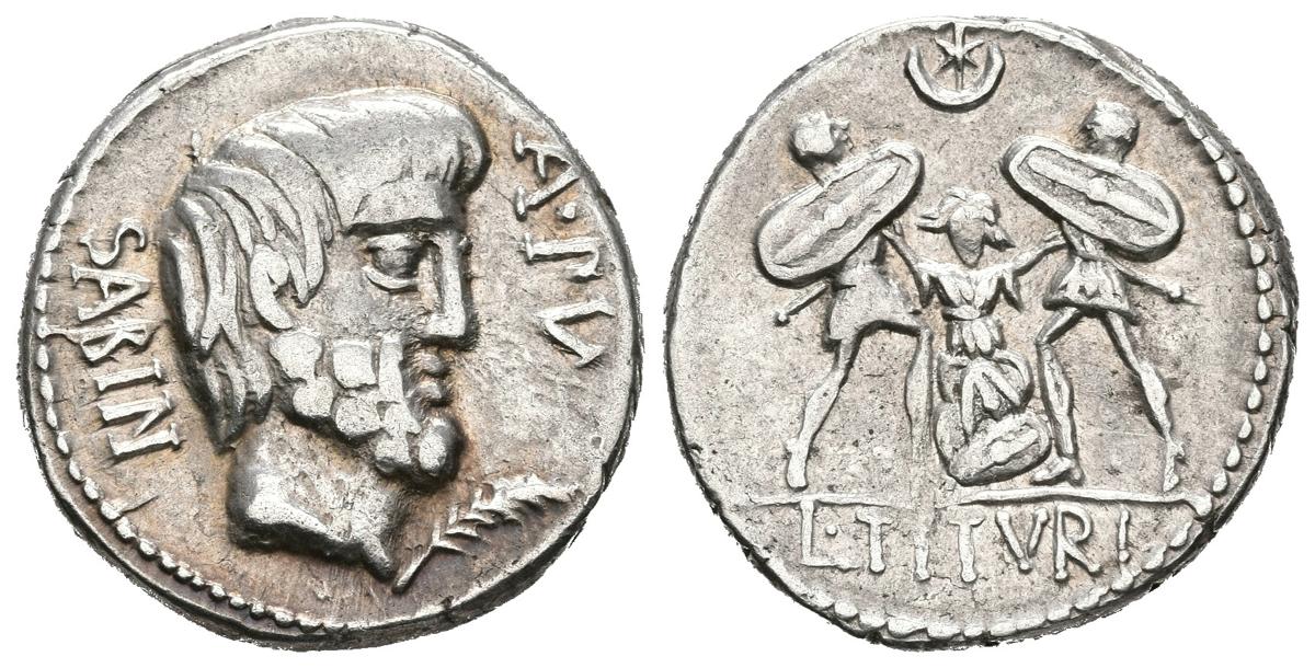 GENS TITURIA. Denarius. (Ar. 4.03g / 18mm). 89 BC Rome. (FFC 1158; Crawford 344 / 2c). Anv: Tatius's head on the right, palm in front and legend: A PV, behind legend: SABIN. Rev: Tarpeia kneeling on shield between two soldiers with shields, crescent and star above, in exergue: L TITVRI. Very Fine.