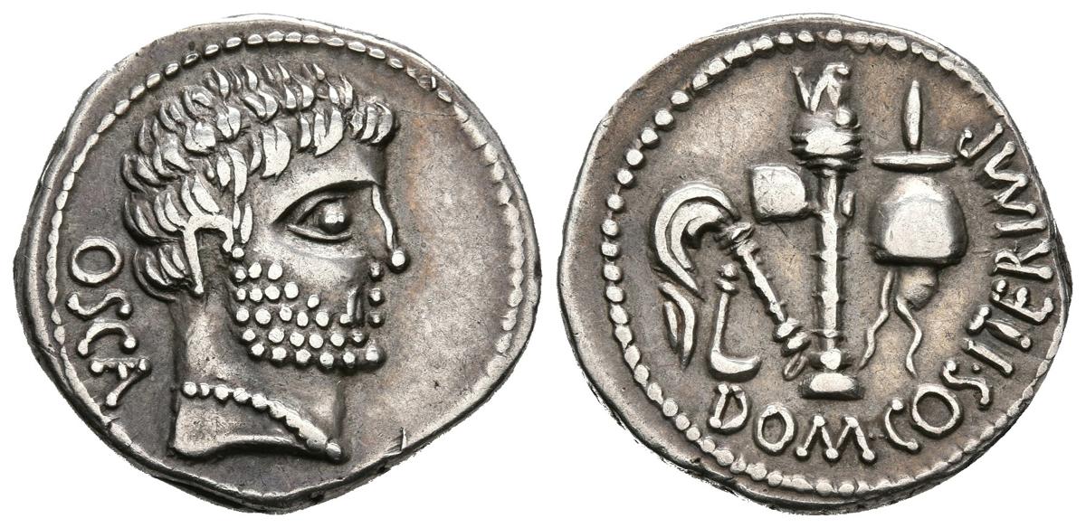 English OSCA (Huesca, Aragon). Denarius. (Ar. 3.42g / 19mm). 40-20 BC (FAB-1923). Anv: Bearded head to the right, behind legend: OSCA. Rev: Symbol, aspergyle, ax and apex, around legend: DOM COS ITER IMP. Almost Extremely Fine. Very rare.