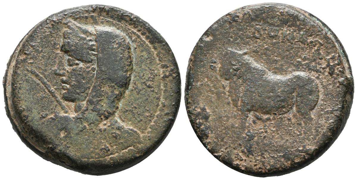 English BORA (Martos, Jaén). As. (Ae. 31.88g / 33mm). 100-50 BC (FAB-289). Anv: Female bust to the left, in front of the scepter. Rev: Bull on the left, above legend: BORA. Very Fine.