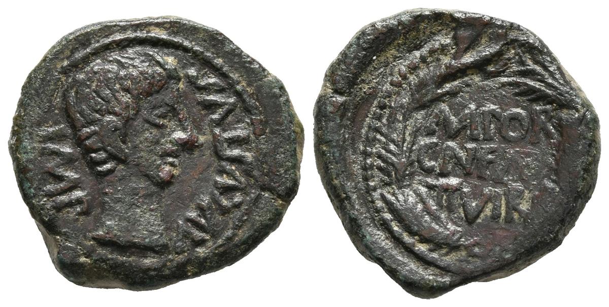 CAESARAUGUSTA (Zaragoza). Quadrant. (Ae. 3.48g / 17mm). 120-30 BC (FAB-341). Anv: Head of Augustus to the right, around legend: AVGVSTVS IMP. Rev: Legend: M BY CN FAD II VIR, within laurea. Good Very Fine.