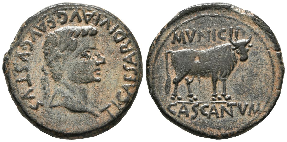 CASCANTUM (Cascante, Navarra). As. (Ae. 12.19g / 29mm). 14-36 AD (FAB-690). Anv: Laureate head of Tiberius on the right, around legend: TI CAESAR DIVI AVG F AVGVSTVS. Rev: Bull on the right, above legend: MVNICIP, below: CASCANTVM. Good Very Fine.