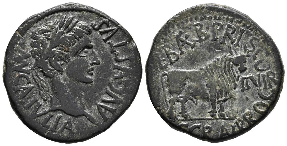 CALAGURRIS (Calahorra, La Rioja). As. (Ae. 11.35g / 28mm). 27 BC-14 AD (FAB-416). Anv: Laureate head of Augustus on the right, around legend: MVN CL IVLIA AVGVSTVS. Rev: Bull to the right, around legend: II VIR L BAEB PRISCUS C GRAV BROC. Almost Very Fine.