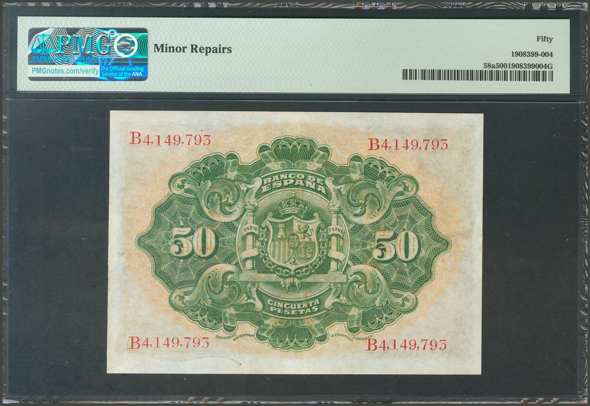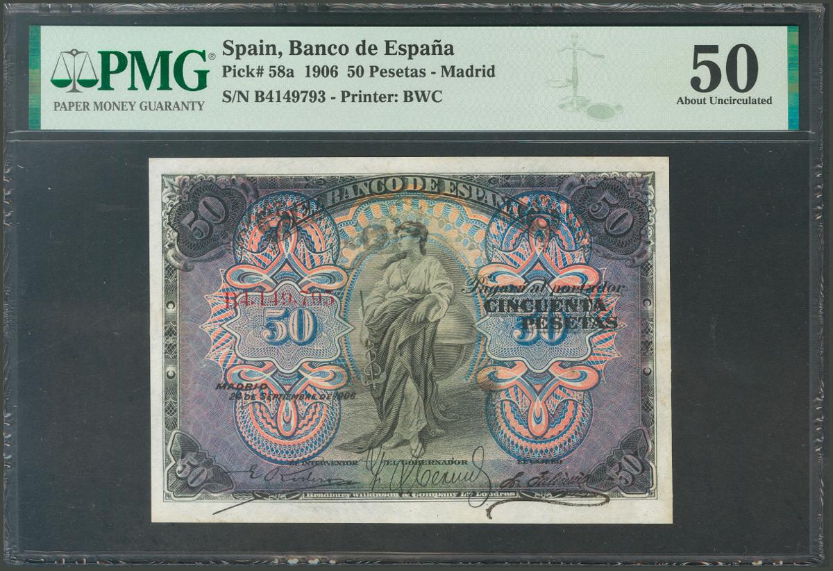 50 Pesetas. September 24, 1906. Series A. (Edifil 2017: 315a). Good Extremely Fine. PMG55.