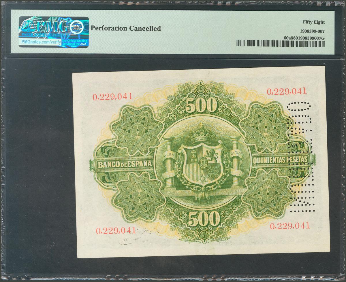 500 pesetas. January 28, 1907. Without series. With "UNUSED" perforation. (Edifil 2017: 316). Very rare. Good Extremely Fine. PMG58 package.
