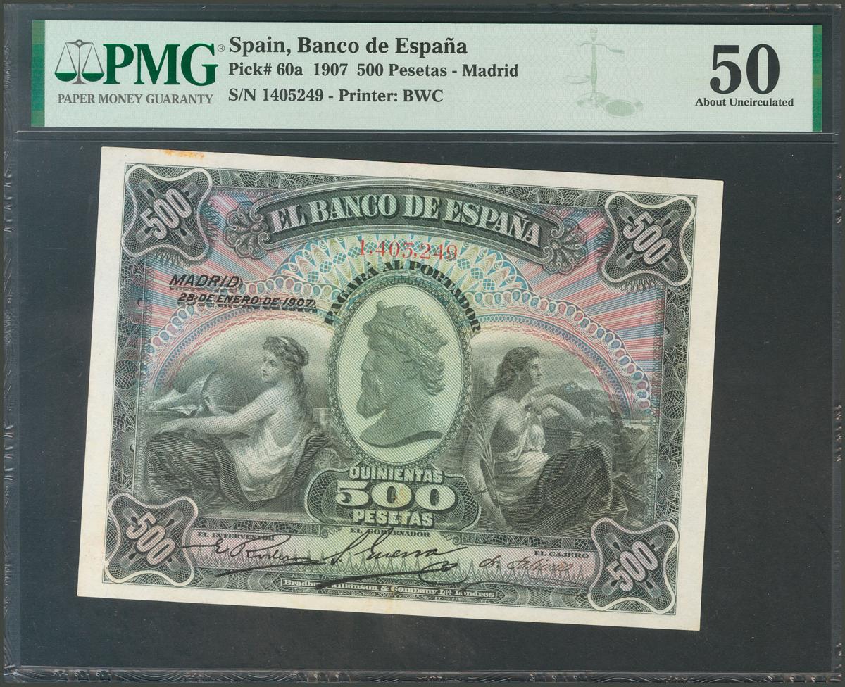 English 500 pesetas. January 28, 1907. Without series. (Edifil 2017: 316). Small repairs, spectacular presence. Extremely Fine. Packaged PMG50.