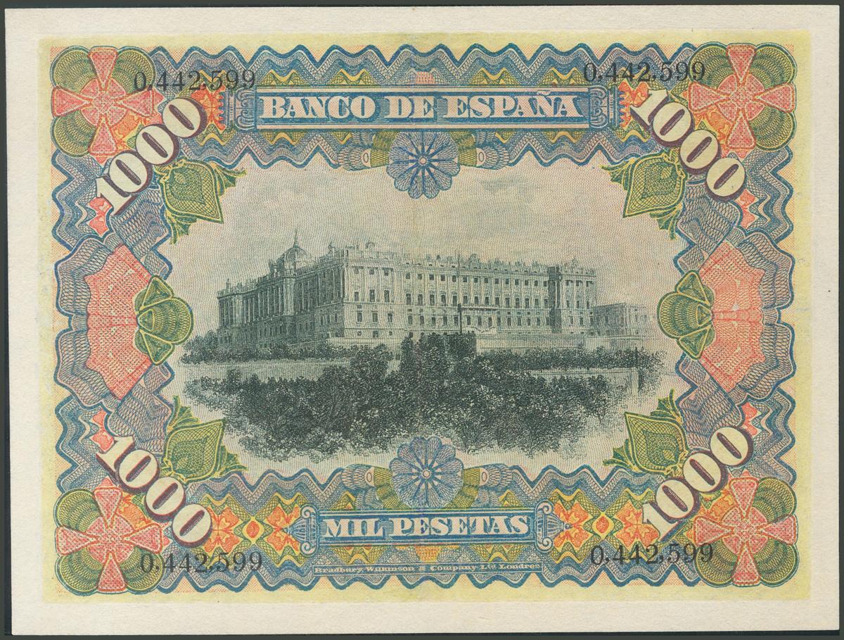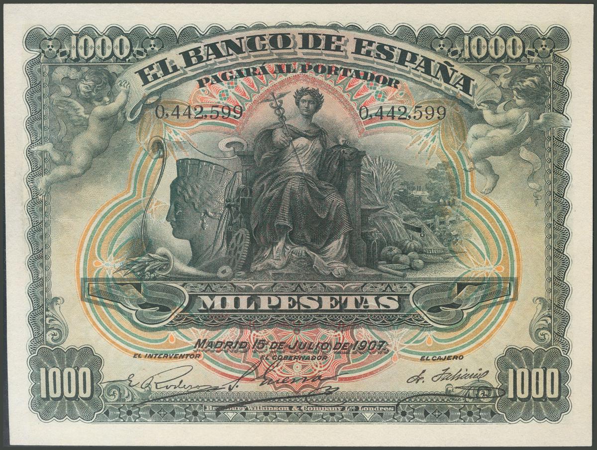 English 1000 Pesetas. July 15, 1906. Without series. (Edifil 2017: 322). Repaired frame, beautiful appearance. Very Fine.