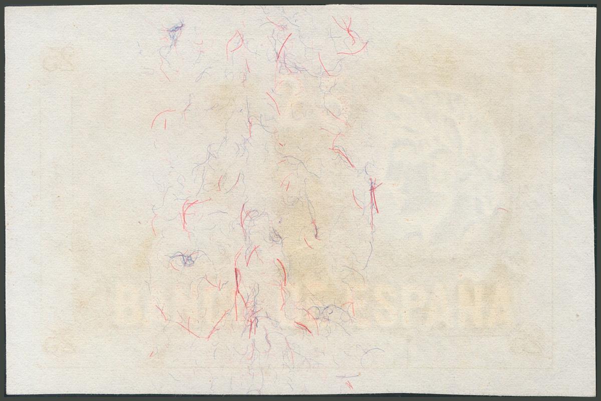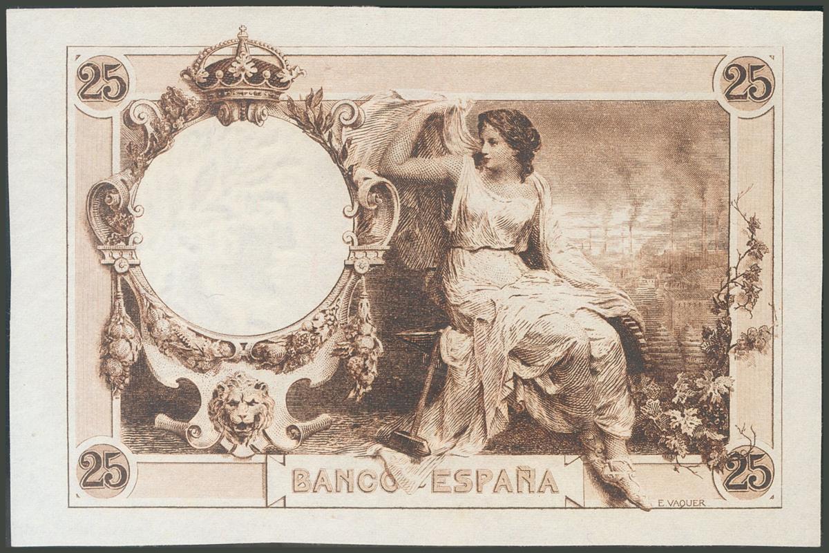 Proof of the reverse in brown-sepia color of the 25 Pesetas banknote not issued from December 1, 1908. (Edifil 2017: NE14Pb). Almost Uncirculated.