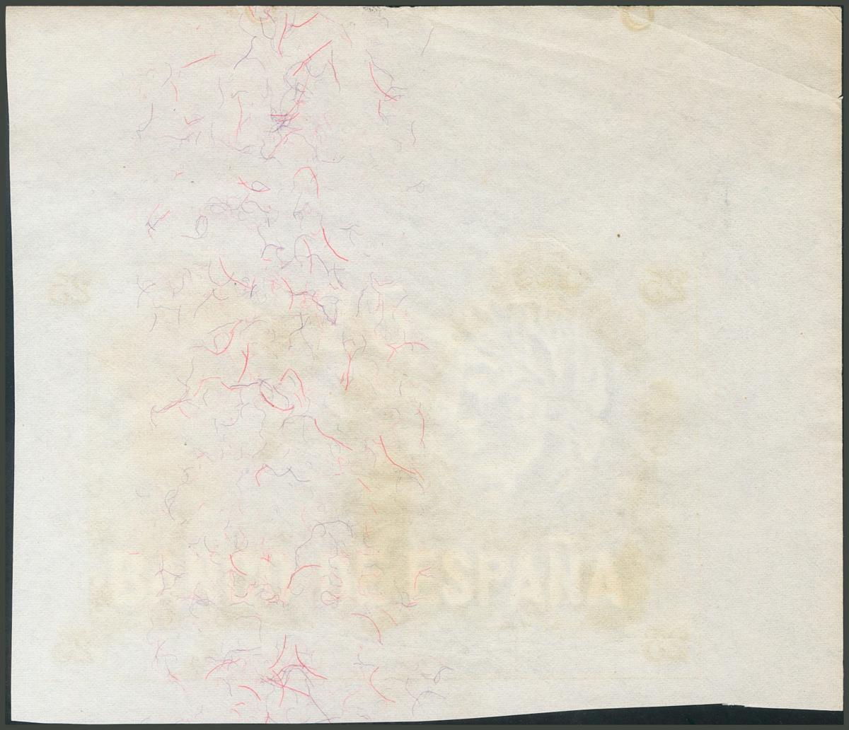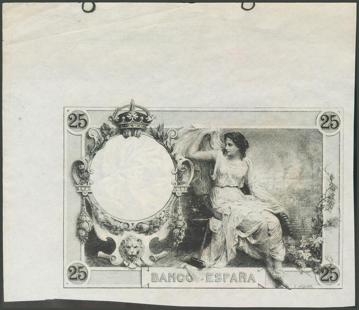 English Proof of the reverse in black color of the 25 Pesetas banknote not issued from December 1, 1908. (Edifil 2017: NE14Pb) Almost Uncirculated.