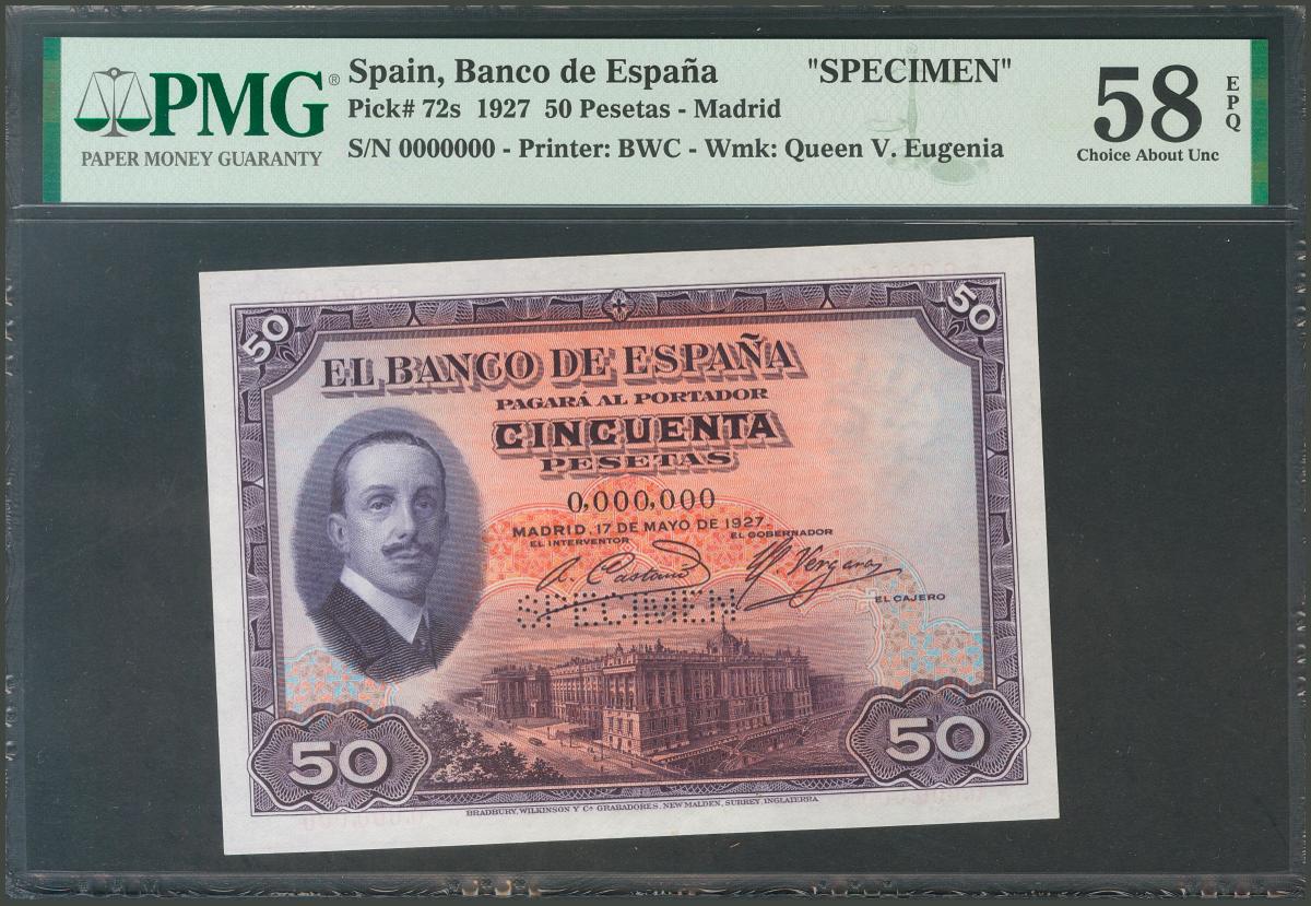 50 Pesetas. May 17, 1927. SPECIMEN and numbering 0,000,000. (Edifil 2017: 326M). It retains all its original size. Good Extremely Fine. Package PMG58EPQ.