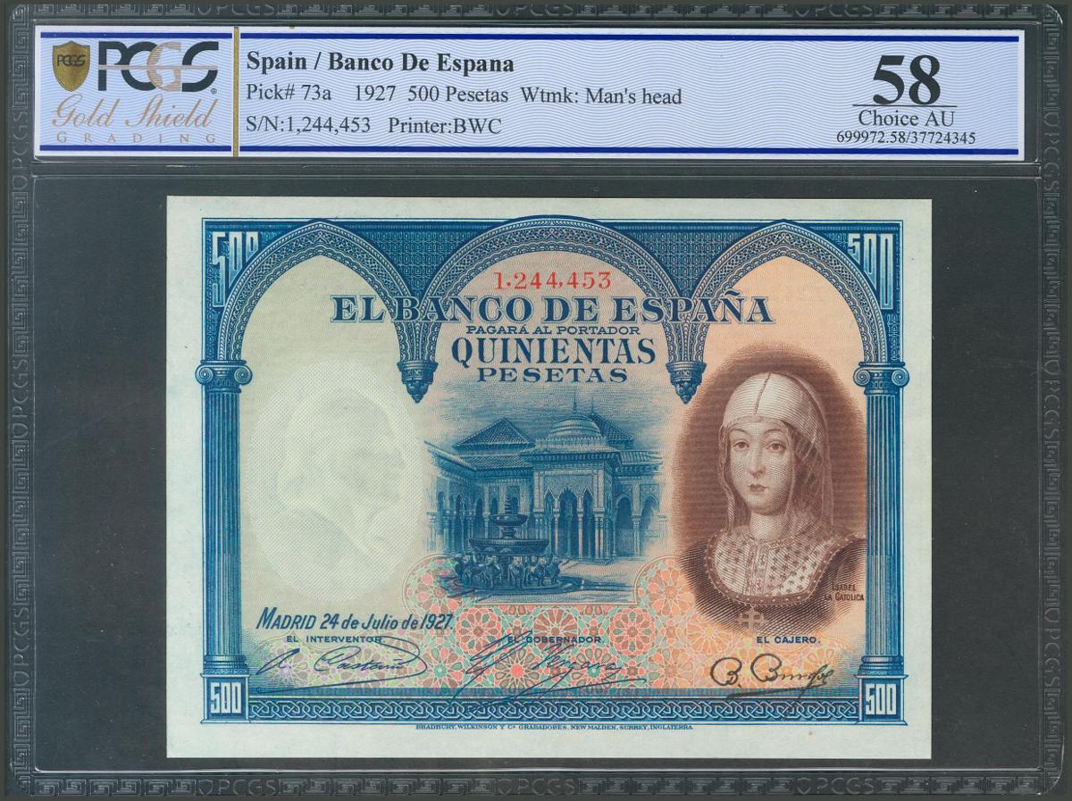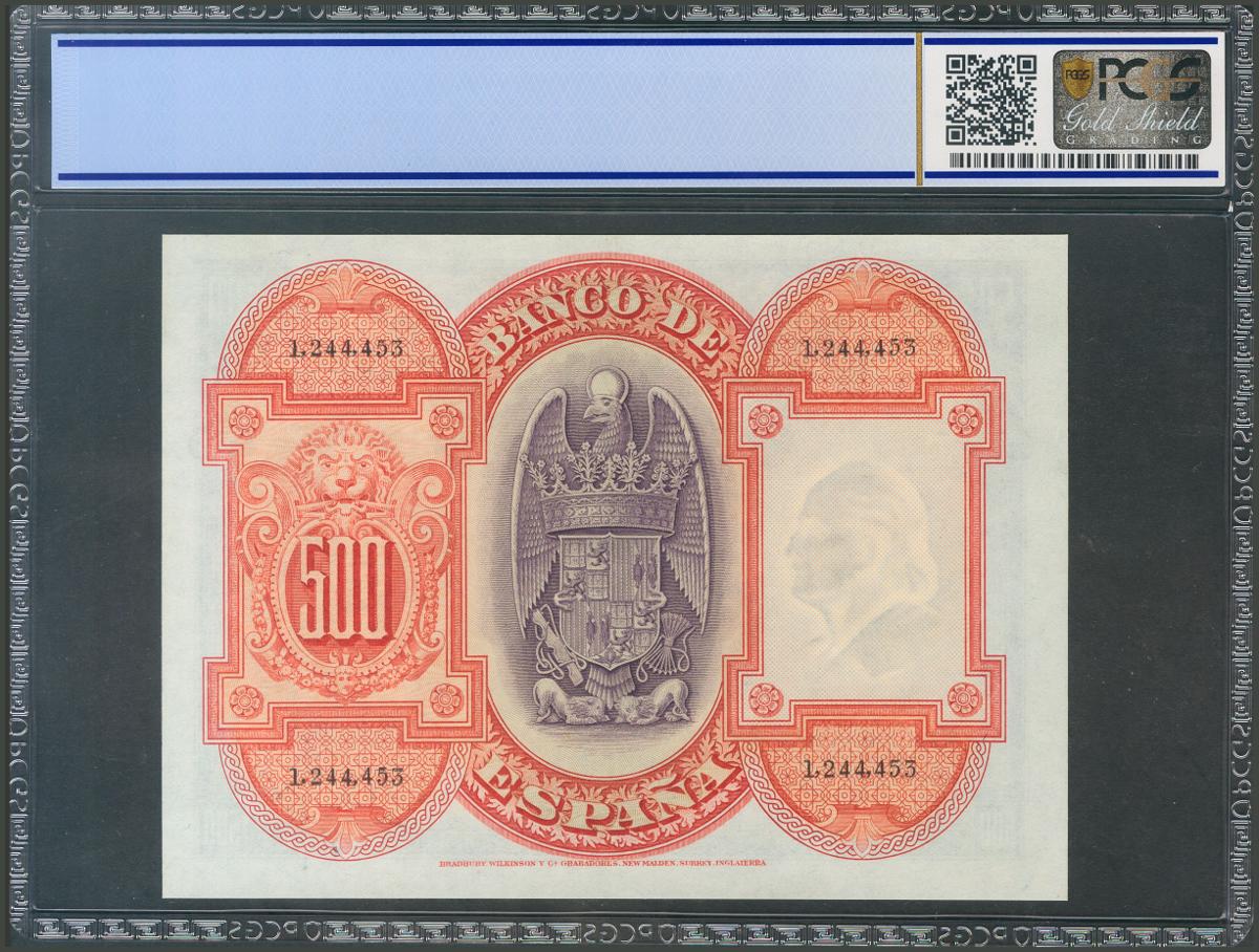 500 pesetas. July 24, 1927. No series and less than 1,602,000 numbers. (Edifil 2017: 327). Unusual like this. Good Extremely Fine. Encapsulated PCGS58.