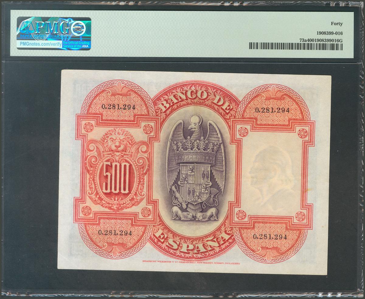 500 pesetas. July 24, 1927. No series and less than 1,602,000 numbers. (Edifil 2017: 327). Extremely Fine. PMG40 package.