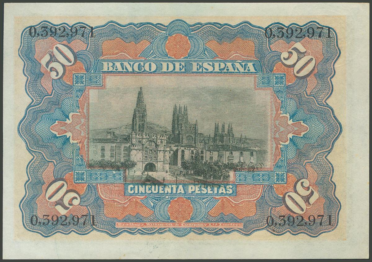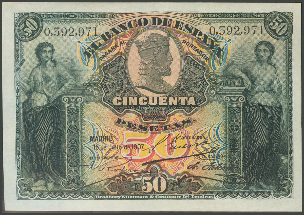 English 50 Pesetas. July 15, 1907. Dry stamp "Provisional Government of the Republic / April 14, 1931". (Edifil 2017: 338). It preserves a large part of the original size. Extremely Fine.