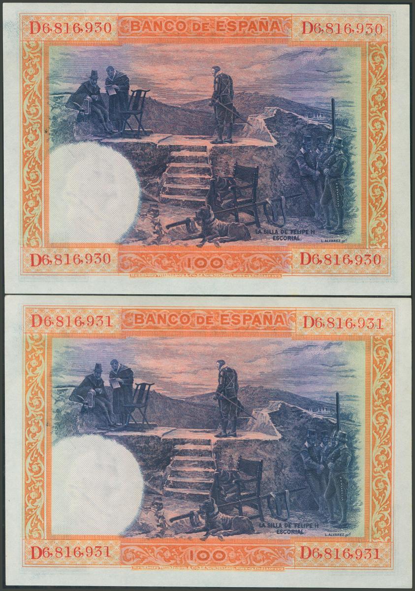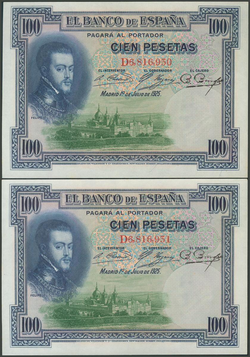 100 pesetas. July 1, 1925. Correlative pair. Series D. (Edifil 2017: 350). It retains all its original size. Uncirculated.