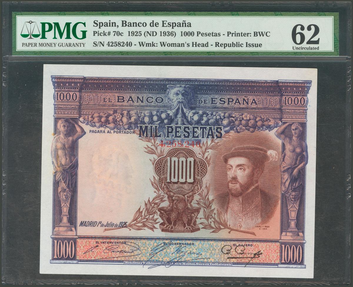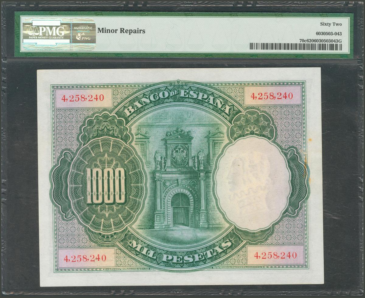 English 1000 Pesetas. July 1, 1925. Without series. (Edifil 2017: 351). Small repair. Almost Uncirculated. Packaged PMG62.