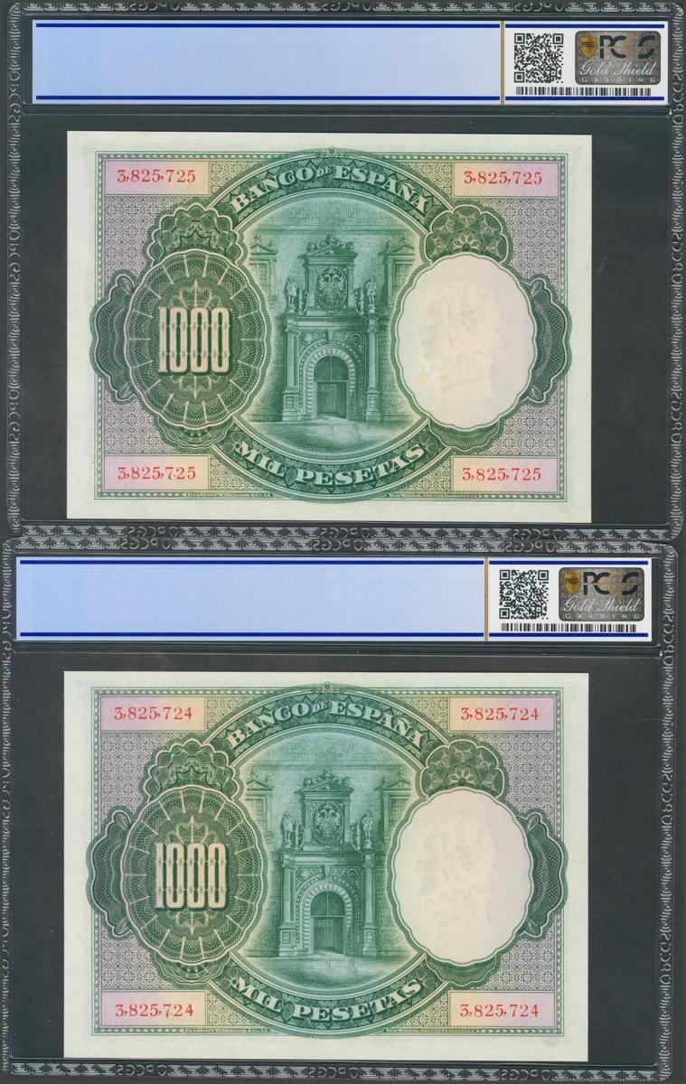 1000 Pesetas. July 1, 1925. Correlative pair. No serie. (Edifil 2017: 351). Good Extremely Fine. PCGS58 package, both.