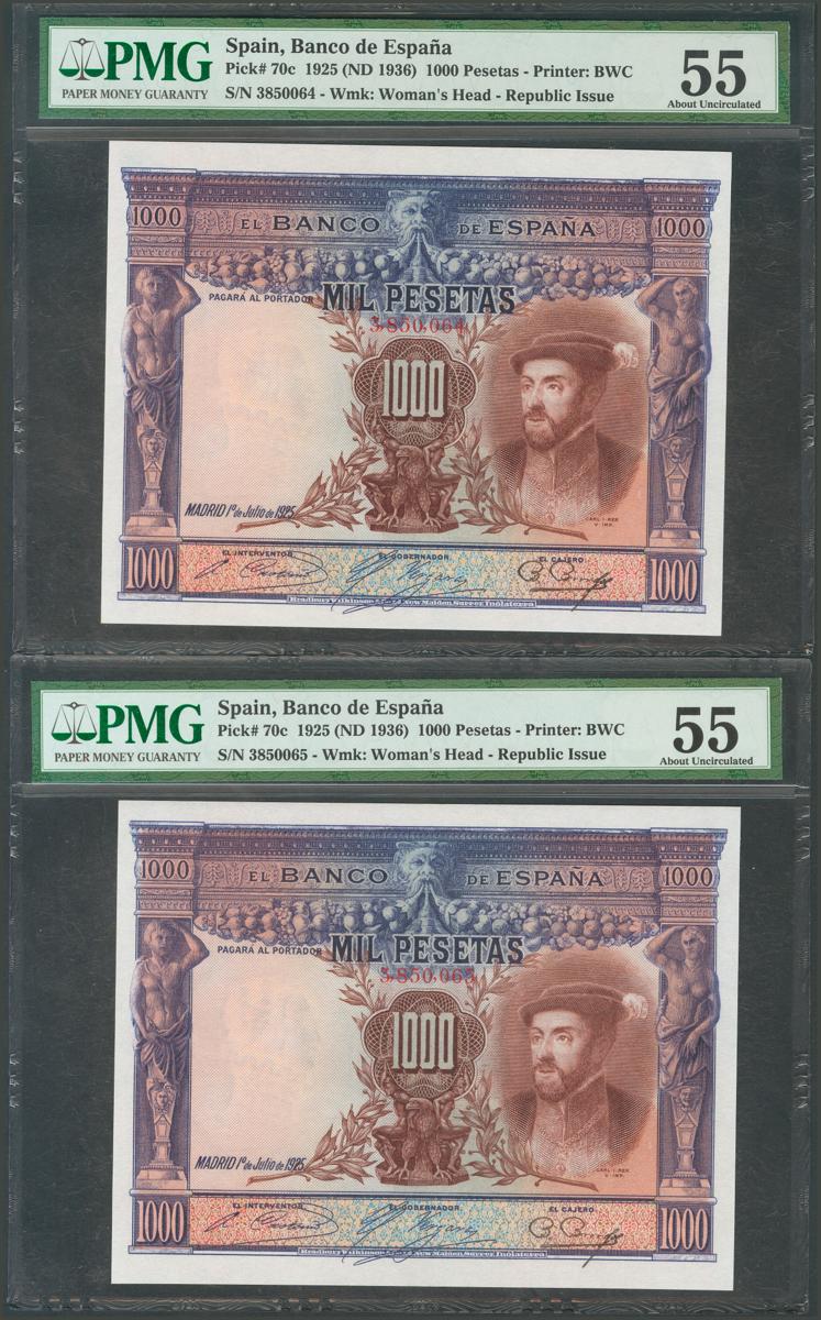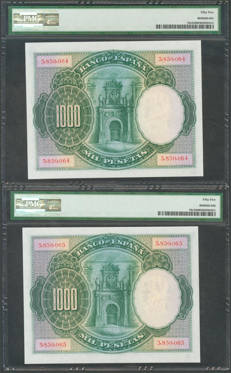 1000 Pesetas. July 1, 1925. Correlative pair. No serie. (Edifil 2017: 351). Good Extremely Fine. PMG55 package, both.