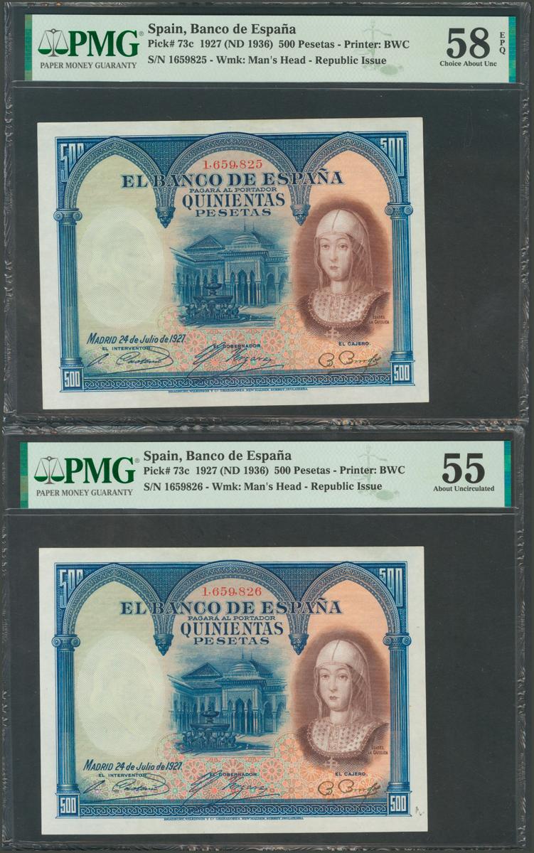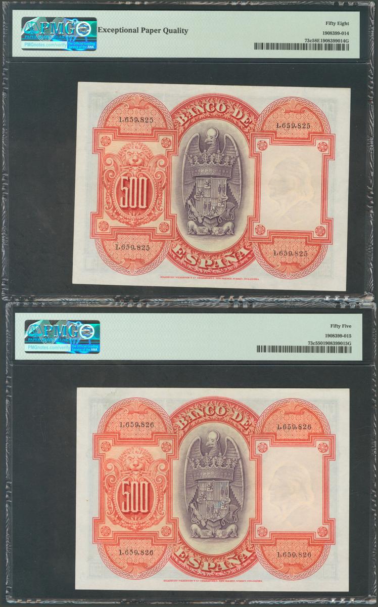 500 pesetas. July 24, 1927. Correlative couple. Without series and after 1,602,000. (Edifil 2017: 352). Unusual, especially with this quality. Good Extremely Fine. PMG58EPQ / 55 packages.